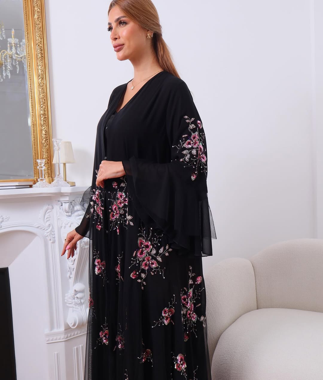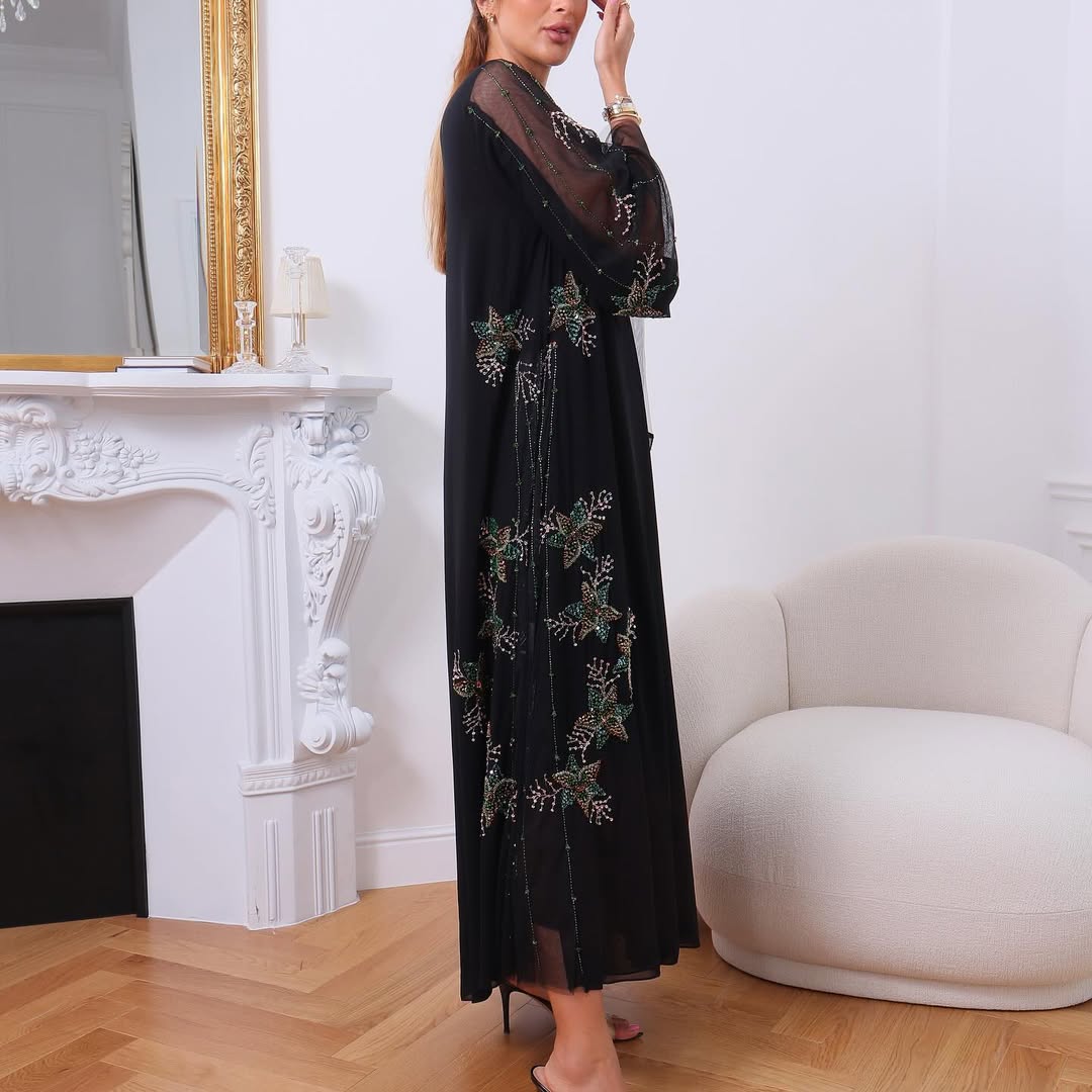 Black Abaya with Laser-Cut Sleeves & Pearl Accents
